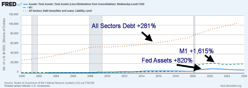 Fed Assets vs. Money Supply M1, All Sectors Debt (government, corporate, consumer) 2000–2026