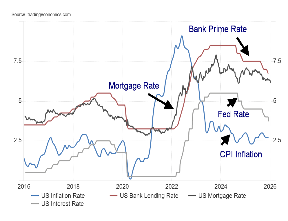 Inflation Rate (CPI) vs. Fed Rate, Bank Prime Rate, 30-year Mortgage Rate 2016–2026
