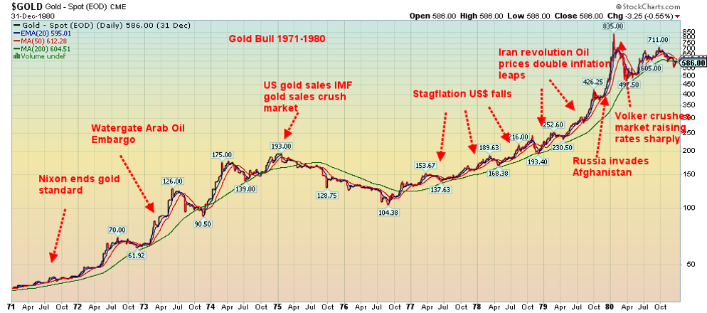 Yes, there was also the 2001–2011 bull market that saw gold rise 668% or about $1,670. Even a move like that today would take gold to over $6,900. But what today’s gold bull feels like is more the 1971–1980 bull than the 2001–2011 bull. Here, geopolitical events and even some domestic political events helped drive the market. A sinking U.S. dollar and the end of the gold standard in 1971 were significant events, along with rising inflation and then stagflation. Geopolitical events included the Arab oil embargo (1973), the Iranian revolution (1979), and the Russian invasion of Afghanistan. All helped push up oil prices, contributing significantly to inflation.
