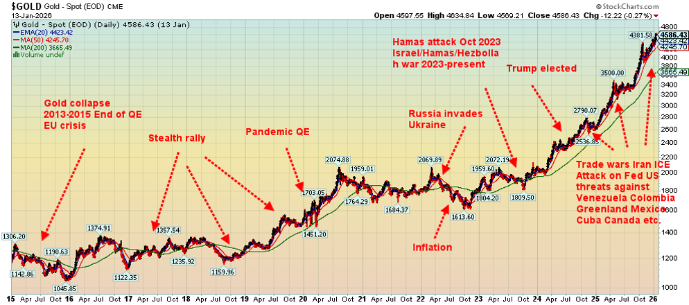 The election of Trump in November 2024 started another gold rally because of threats by Trump to unleash a trade war. That became a reality in April 2025. Since then, we have seen a series of events that continue to drive gold higher.