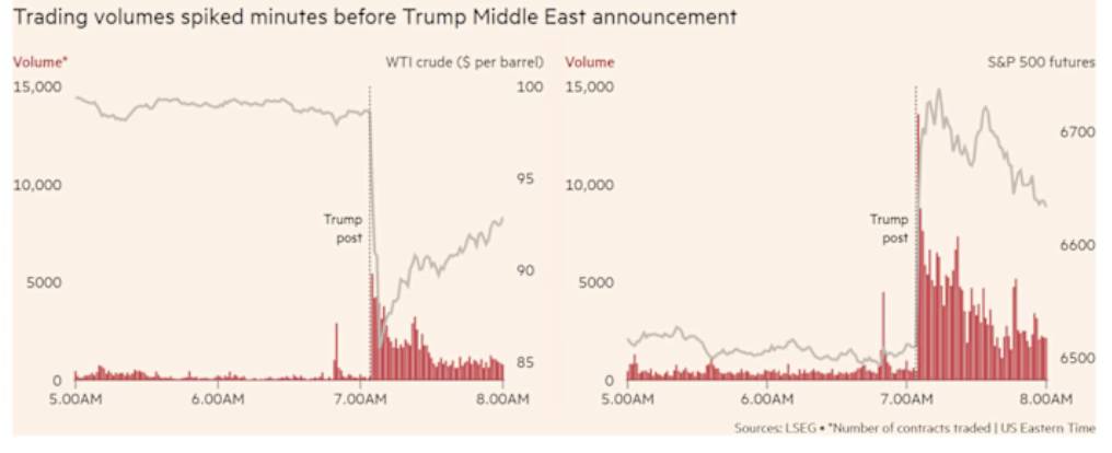 Roughly 15 minutes before Trump announced his change of heart to delay the obliteration of power plants on March 23, 2026, some people bet $500–$600 billion dollars that the price of oil would fall and stocks would rise. Predictably, Brent fell 15%, while WTI also fell about 15%. They also bought S&P 500 futures, and then the stock market rallied. The exchange had no comment, nor did The White House.