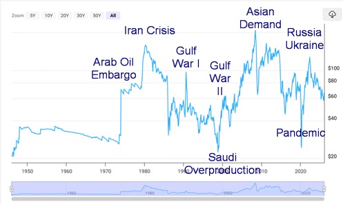 The world has gone through a series of oil crises since the Arab Oil Embargo in 1973 during the Yom Kippur War. That was followed by peaks in 1980 (Iranian crisis), 1990 (Iraq invasion of Kuwait), 2003 (U.S. invasion of Iraq), 2008 (a huge surge in global demand from Asia, led by China), and 2022 (Russia/Ukraine war).