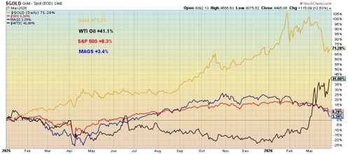 Price Performance Gold, SPX, MAGS, WTI Oil 2025-Present