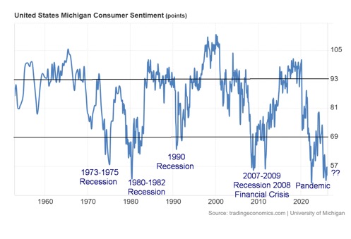 The University of Michigan Consumer Sentiment Index is at its lowest level since the pandemic. It’s at levels comparable to the 1973-1975 recession, the 1980-1982 recession, and the 2007-2009 Financial crisis recession. Yet we are not yet in a recession.