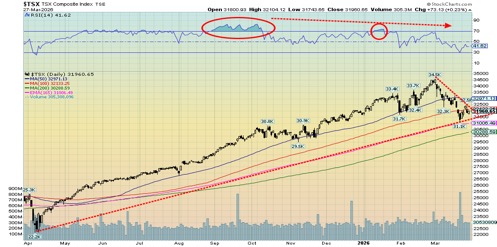 The S&P 500 has broken the 200-day MA support and the neckline of that rounding top pattern. Projections are down to at least 6,000. Below that level the next target would be 5,700. The TSX is hanging in as long as Golds, Metals, Materials, and Energy hold up. Those are the key areas.