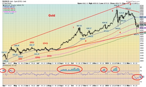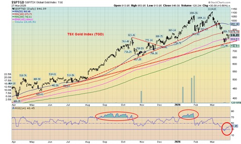 Whither gold? The indestructible metal, a centuries-old safe haven. It has taken a hit. At the recent low gold had fallen 27%, officially a bear market. Silver had fallen 50%, while the TSX Gold Index (TGD) was down only 30%, a surprise, really. Normally the TGD would be down at least 70% as it was in previous collapses in 2008 and 2020. View that as a win. That this correction was overdue given the sharp rise during 2025 and early 2026 should not have been a surprise. That it has gone deeper and lasted longer than many expected is probably a bit of a surprise.