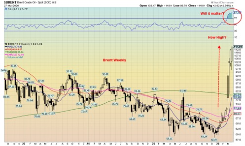 Applying technicals to the oil market is difficult because this rise is completely dominated by the war, which does not appear likely to stop anytime soon. Even if it did, it would take weeks to get the Straits of Hormuz open again, just in the clearing of mines and other obstacles, for example. Considerable damage has already been done to infrastructure in Saudi Arabia, Bahrain, Qatar, and the UAE. Any attempt to attack Kharg Island could be met with more attacks on fields in the named countries. It will take months if not years to repair the damage, and at a cost of billions of dollars.