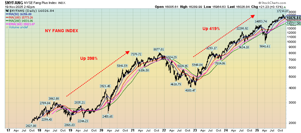 We identified two phases of rise. First, from 2017 to 2021, and, second, from 2022 to 2025. The NY FANG rose 398% in the first phase and 416% in the second. Altogether, from that start-out low in 2017, the NY FANG Index rose 8.5 times. We don’t know how this bubble will burst. The big banks aren’t as involved with AI companies as they were with the housing market of the early 2000s.