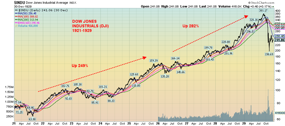 Like all bubbles, this one was debt-fueled. Use of broker margin loans exploded. Everybody was trying to get in and get rich. Go to the bank, borrow money; after all, the stock market just keeps going up. From that low in 1921 that ended the post-war depression, the Dow Jones Industrials (DJI) rose six times. We’ve identified two periods: 1921–1925 where the DJI was up 249% and 1926–1929 when the DJI leaped 282%. It was an exciting period.
