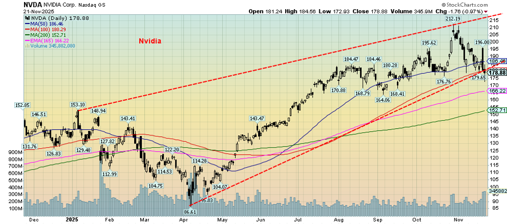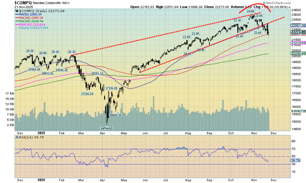 This past week the stock markets were battered, with the Nvidia earnings that exceeded expectations sparking a rally, followed by a sharp reversal (sell the news?) and an outside day reversal. The next day, on thoughts of a Fed rate cut in December, the market rebounded sharply. Volatility? It seems so. On the week, the S&P 500 fell about 2.0%, the Dow Jones Industrials (DJI) fell 1.9%, the Dow Jones Transportations (DJT) fell 0.4%, while the NASDAQ was down 2.7%.