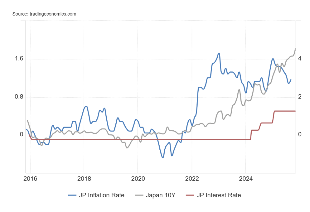 Japan – Bank of Japan (BOJ) interest rate, 10-year government bond yield (JGBs), Japanese inflation rate 2015–2025