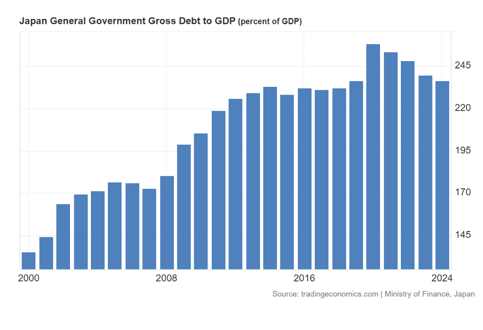 Japan is extremely sensitive to interest rates. Its government debt to GDP is an astounding 236%, the highest in the G7 and, if not for Sudan, the highest in the world. Japan has been printing money for years. Its money supply has exploded, particularly in the last five years, in order to prevent a collapse during the pandemic. For years, interest rates were held below 1% and even for a time below 0%. Now the maturities are having to refinance themselves at sharply higher rates. The bulk of the maturities are short dated.