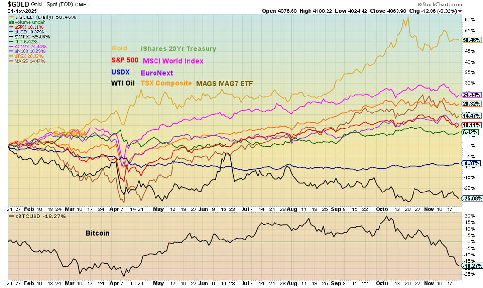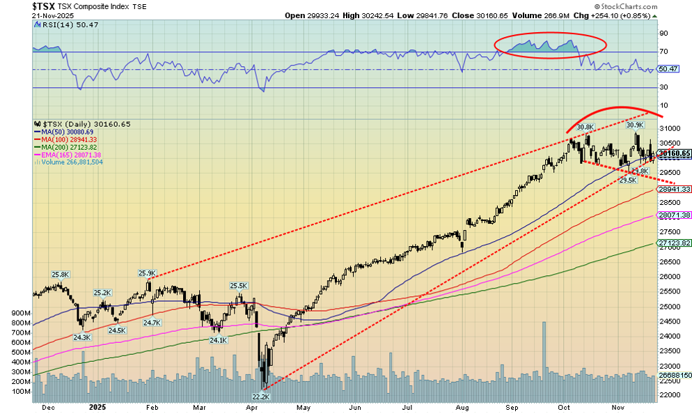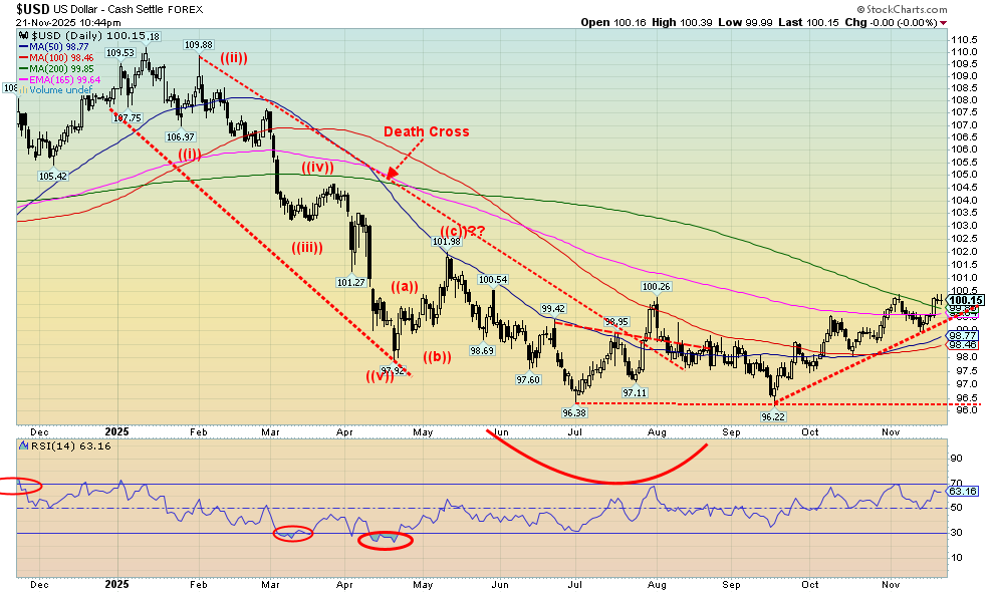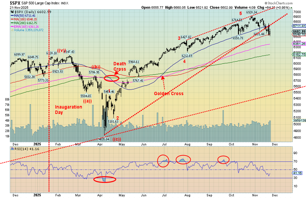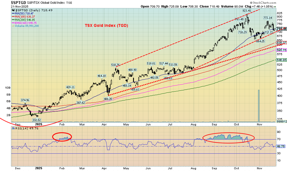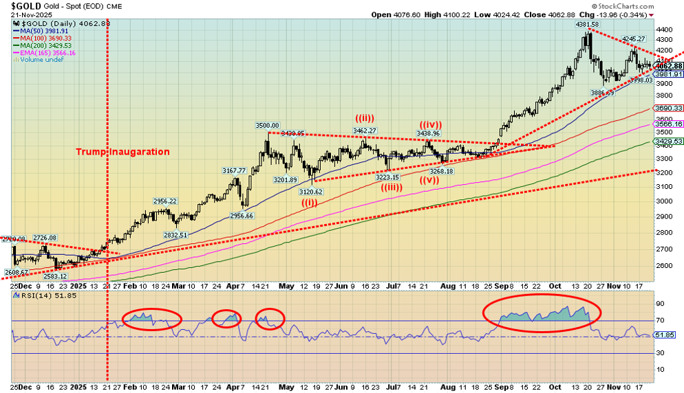 On the week, gold fell 0.5% but remains up a healthy 53.8% on the year. Silver fell 1.4%, platinum was down 2.3%, and of the near precious metals, palladium was off 1.9% and copper fell 1.0%. The gold stocks naturally fell as well. The Gold Bugs Index (HUI) lost 3.4% while the TSX Gold Index (TGD) dropped 3.3%. A lousy week all around, but definitely not a disastrous week. Of concern is that gold fell from its high of $4,381, hitting a low of $3,886 before rebounding back up to $4,245. Given that it fell short of the previous high it’s a signal that we could now be on a C wave down.