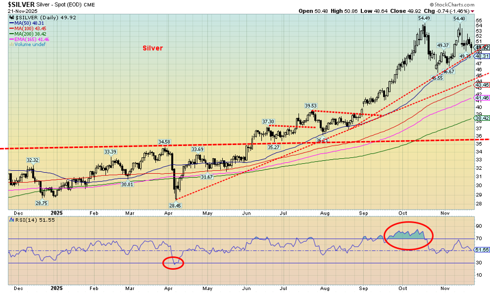 A break back under $3,886 could, in theory, project down to $3,400. That would be about a 13% correction. A reminder that, during the 2009–2011 gold bull market, gold fell twice around 13%–15% and three other times as well where the decline approached 10%. A correction of that nature is not unusual. Since this rally started in 2022, we’ve already had one correction of 13% and two other corrections of under 10%. We still expect a potential low into December before another up leg gets underway. Could the Fed at its December 9–10 meeting be the catalyst? We remember well the Fed meeting of December 2015 that ignited a strong gold rally into 2016. Could lightning strike twice?