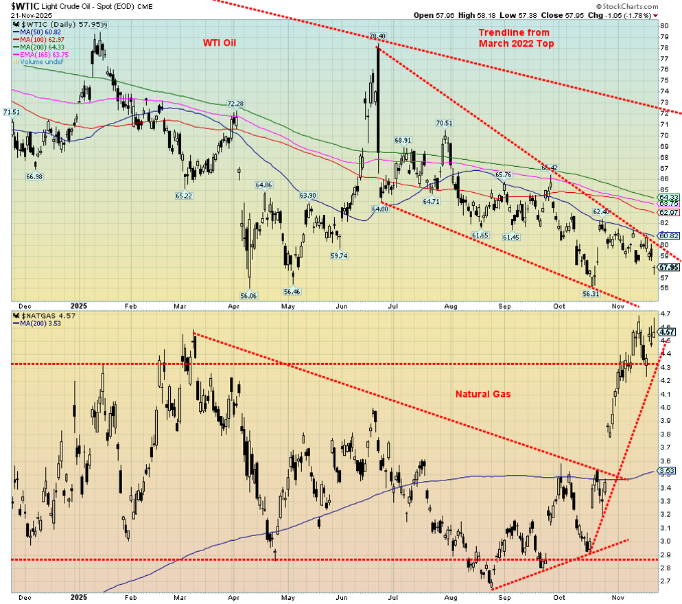 Oil – down again. This time it’s the thought that the Russia/Ukraine war might be settled, given the U.S.’s 28-point peace plan. But will the plan be accepted? Or accepted with amendments? All of these are unknown. But the markets took the easy out, given the potential for higher Russian oil supply to the market. Oil prices fell.