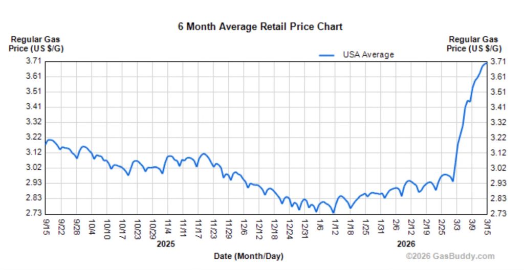 trapped helium, sulfur, LNG, and aluminum – all needed in the production of semiconductors and even AI. Many of these products were destined for Taiwan and South Korea, key manufacturers in the production of semiconductors. It has only been two weeks since the war began and already, we are seeing the negative impacts. Checked gas at the pump’s prices lately? Rising gas prices are shown below. For the record locally we’ve seen gas prices rise from $1.30/litre to $1.65/litre in two weeks.