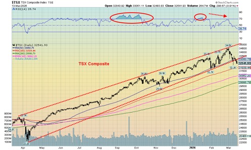 The TSX Composite has the same dilemma. A break under 31,700 could spell lower prices ahead. At minimum we need to regain 33,000 to suggest a low. Above 34,000 a low is in. It should be no surprise that markets are reacting negatively to the outbreak of war on Iran. Shut off the global oil supply and things might deteriorate. The outbreak of war is often negative for stocks, but sometimes it has the opposite effect.