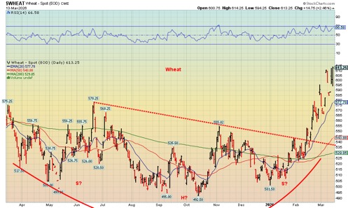 Speaking of fertilizers being blocked in the Gulf, we couldn’t help but notice that wheat prices have soared as a result. Wheat prices have soared out of what appears as a double head and shoulders bottom pattern. Targets could be as high as $625.75, a level almost achieved. If we successfully break through that level, then the next target could be $678. Wheat is up only 3.7% since the war started, but it broke out of the possible double head and shoulders pattern on February 12, 2026. Since the October 2025 low we are up 24.5%. If wheat prices are soaring, food prices are not far behind.