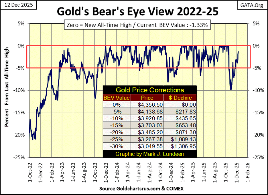 Here is gold’s BEV chart. In November, gold fell below scoring position, but bounced off its BEV -10% line. Now in December, once again gold is in scoring position. So, once again we should assume gold will soon be making new all-time highs, or BEV Zeros in its BEV chart below. Gold closed the week only 1.33% below its last all-time high, a gap that could easily be closed should gold see a good day next week.