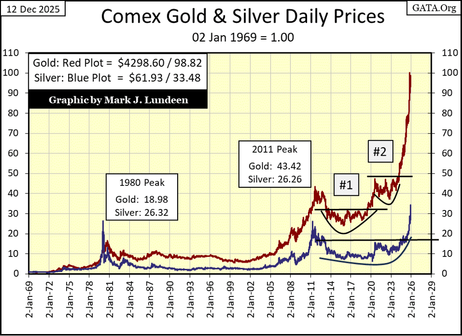 As significant as silver’s recent advance has been, since 1969 it has underperformed gold by a large measure, as seen below. But that wasn’t so during the 1969 to 1980 precious metals bull market, where at their January 1980’s peak, the gains in silver far outperformed the gains seen in gold.
