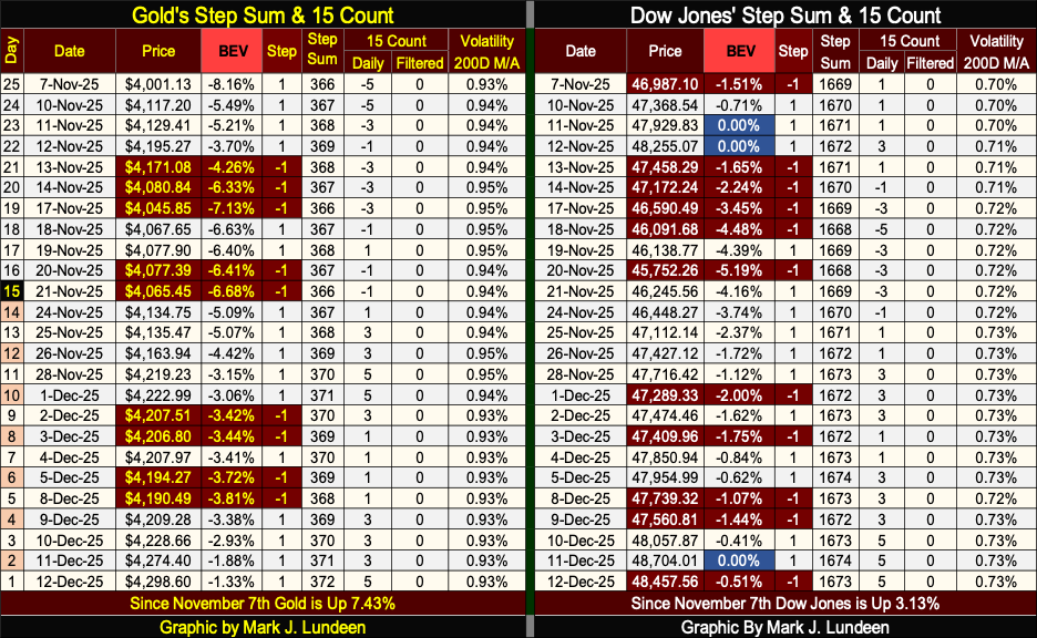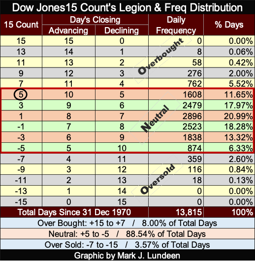Like gold, the Dow Jones also closed the week with a 15-count of +5, a neutral count, just below having the market overbought with a +7, see table below.