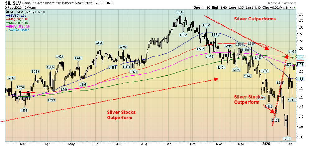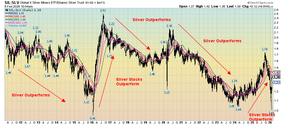 During this period, silver outperformed in bear or down markets while the silver stocks outperformed in bull up markets. The ratio peaked in September 2025 at 1.74 and from September to January 29, 2026, silver was outperforming the silver stocks. But the crash on January 30, 2026, changed everything. Since then, the ratio has climbed back up to 1.38, indicating that since the crash the stocks have been outperforming.