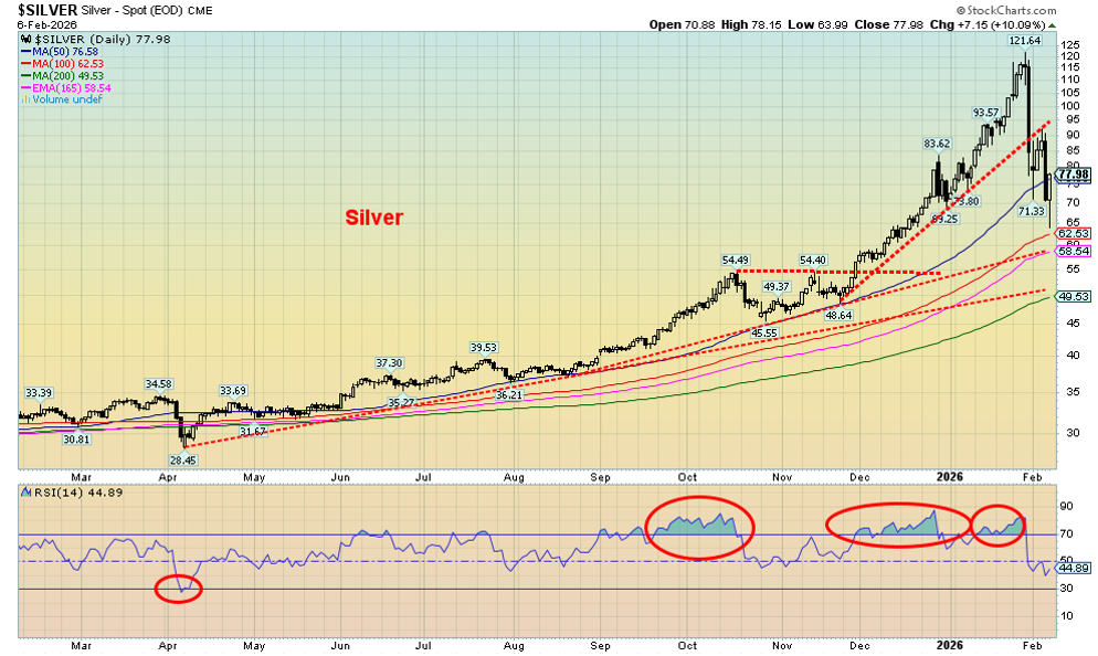 Much has been written about the silver slaughter of January 30th, 2026. That day, silver fell a mind-boggling 27%. Altogether, the decline from top to bottom (to date) was 41.4%. In a nanosecond, silver went from a bull market to a bear market with nothing in-between. Gold was hit as well but to date its decline is only 21.5%. That’s also a bear market. The change from bull to bear was as dramatic as anything we’ve ever seen.