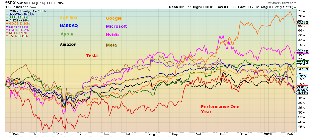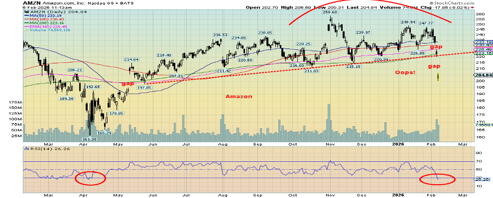 Amazon has been one of the poster children for the MAG7. Amazon’s CEO, Jeff Bezos, is also a favourite of President Trump. But is Amazon’s party over? Those gaps down look like a serious “oopsy.” If Amazon has problems, the other MAG7 stocks could follow. Google has been the big star, but we note that besides Amazon, Microsoft and Tesla are now down on the year. Nothing magnificent about them. Some of the others are rolling over. The MAG7 led the way up. Could they lead the way down? This past week alone saw six of the MAG7 down on the week with only Apple up.