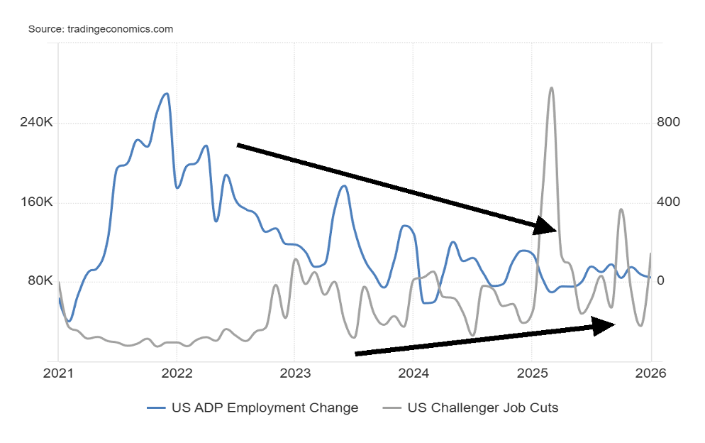 U.S. ADP Employment Change, Challenger Job Cuts 2021–2026