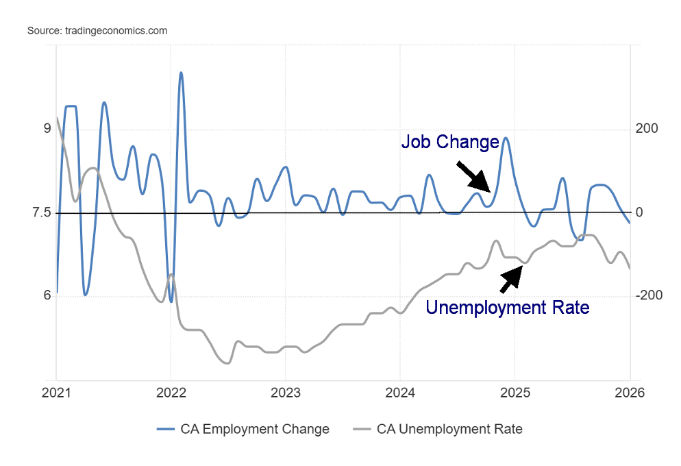 Employment in Canada fell some 24,800 in January 2026. That followed a 10,100 gain in December and expectations of a gain of 7,000. The unemployment rate fell to 6.5% from 6.8%. Not so good the job losses but the unemployment rate fell. The good news is that full-time employment increased 44,900 while part-time employment fell 69,700.