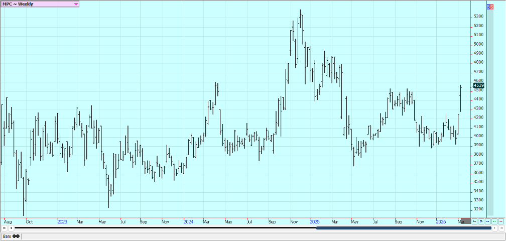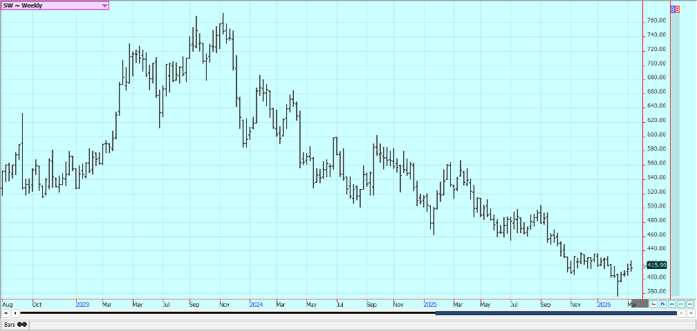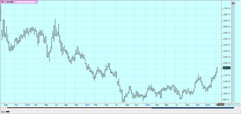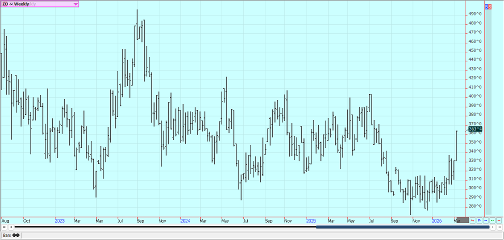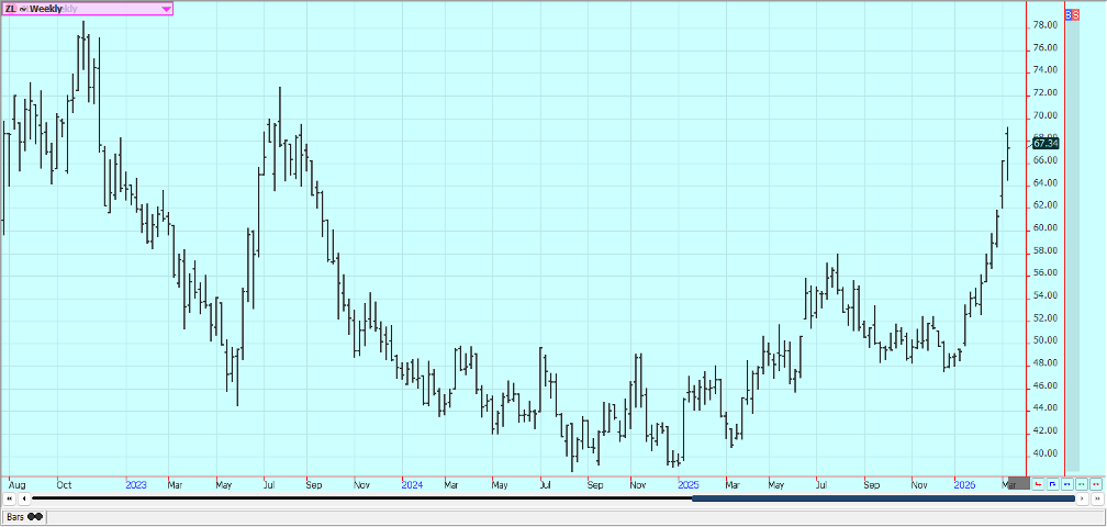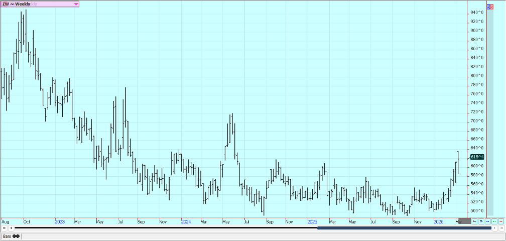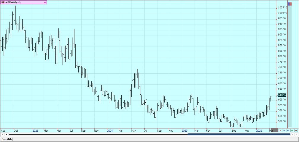 Wheat: Wheat closed a little higher in Chicago and a little higher in KC last week in response to the war in Iran. The weekly export sales report showed stronger than expected demand. Middle eastern countries are big buyers of world Wheat and many have been bombed by Iran now. Conditions are too dry in much of the US Great Plains and too wet in the US Midwest and in western Europe for best production and quality potential.