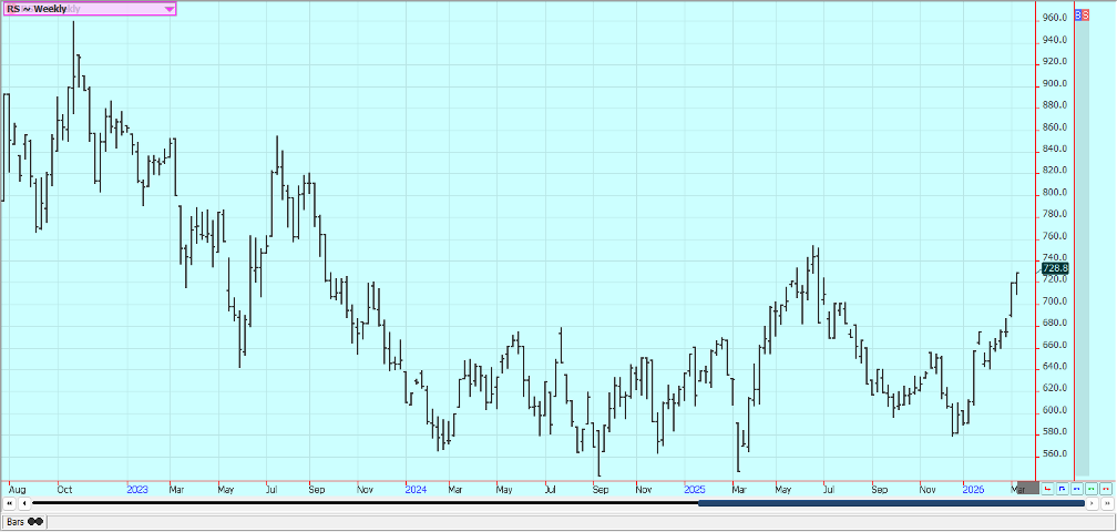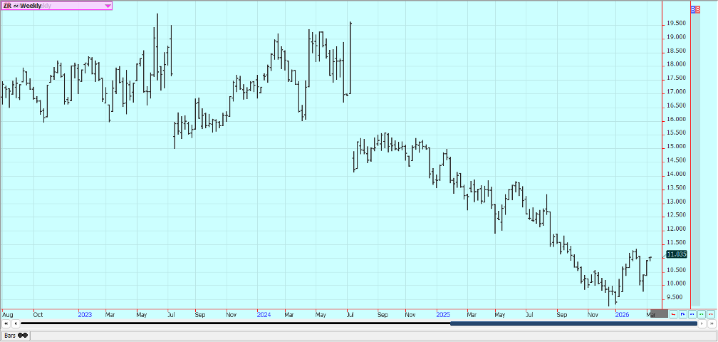 Rice: Rice closed a little higher last week. Trends are still up after a big war related rally as world supplies and trade in Rice could be disrupted, especially in the region near Iran. Traders anticipate less production this year in the US and around the world due to low prices. Asian Rice prices are higher due to war concerns. Trends are mixed as demand remains moderate for US Rice. USDA made no significant changes in the domestic and world WASDE data.