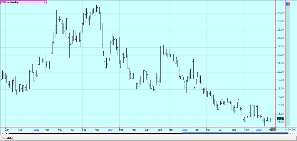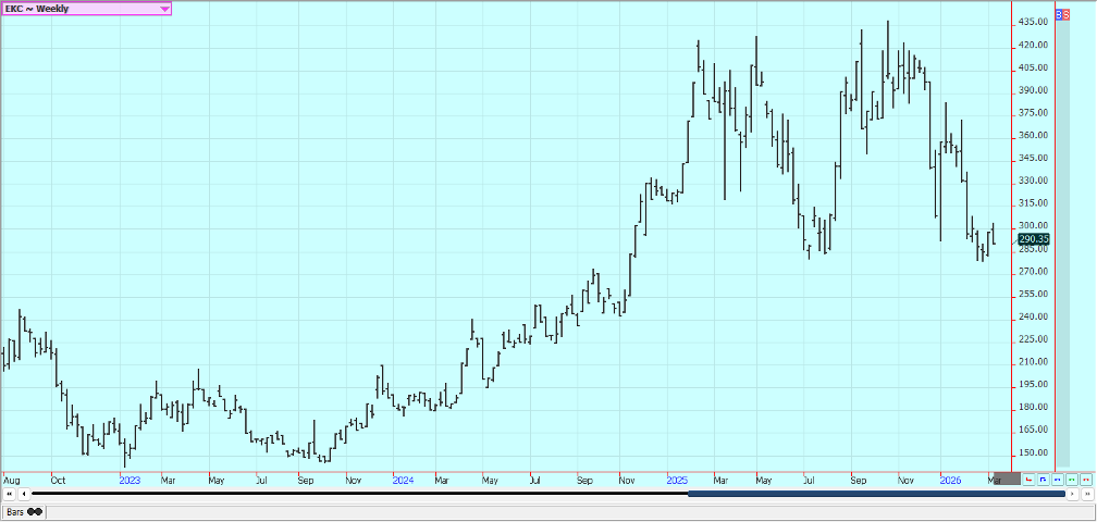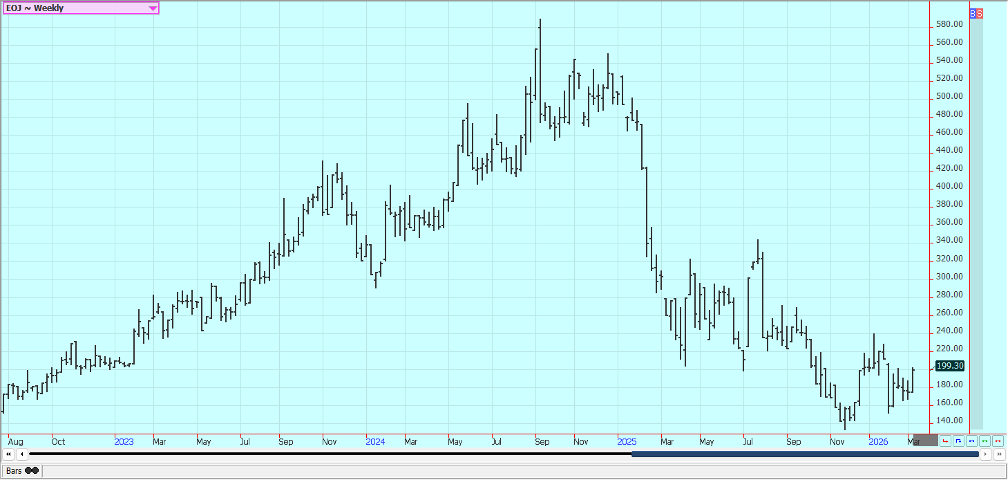 Trends are mixed on the daily sugar charts in New York but are turning down in London. There are good sugar supplies for the market from good growing conditions for sugar cane and beets around the world. The prospect of a big global sugar surplus in the 2025/26 season was keeping the market on the defensive but a rise in sugar production in India and Thailand being offset by the war.