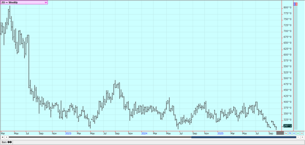 Yields have been reported at or less than APH in areas east of the Mississippi River. Temperatures should average near to below normal this week and there are forecasts for mostly dry conditions. Most of the western Midwest has seen adequate or greater precipitation and production ideas are high. Areas east of the Mississippi River have been very dry for the last month or more. Demand for Corn in world markets remains moderate to strong. Oats were a little lower.